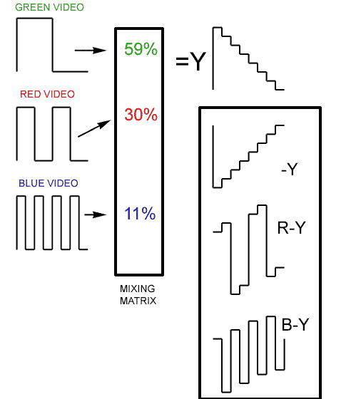 To transmit "RGB" video requires three cables, or three television channels. SO... we're going to squeeze them into the space of ONE channel, AND we're going to do it in a way that millions of black and white TV's will not notice, and will still render a a good monochrome picture. |