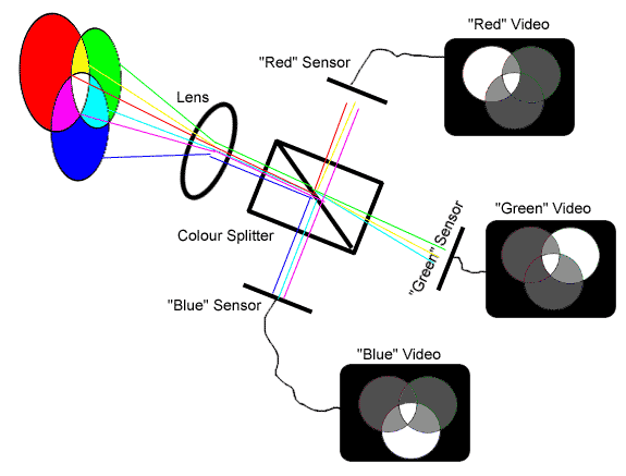 a colour-splitting arrangement. The "Green" sensor sees any