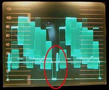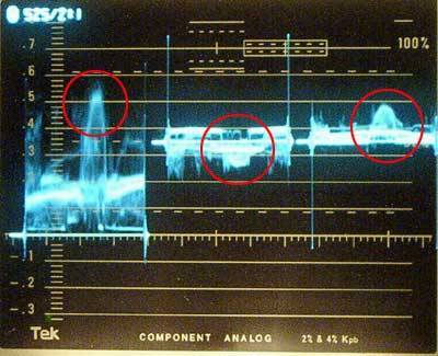 The face is circled in each display. Note the pB (Blue difference) shows negative blue, and the pR (Red difference) has a positive value. There is no blue on the presenter's face. The big spikes are numbers in the signal that signify SAV and EAV... start and end of Active Video. That replaces the old sync pulses. The scale on this waveform is calibrated from 0= black to .7 = white. If you remember that the old one volt of video was displayed on a scale of 140 units (-40 sync to 100 units = white), and you know how to use a calculator, you can figure out where the .7 (actually .714) comes from. Most waveform monitors offer switch-able scales, and you can choose the old 0-100 scale. |